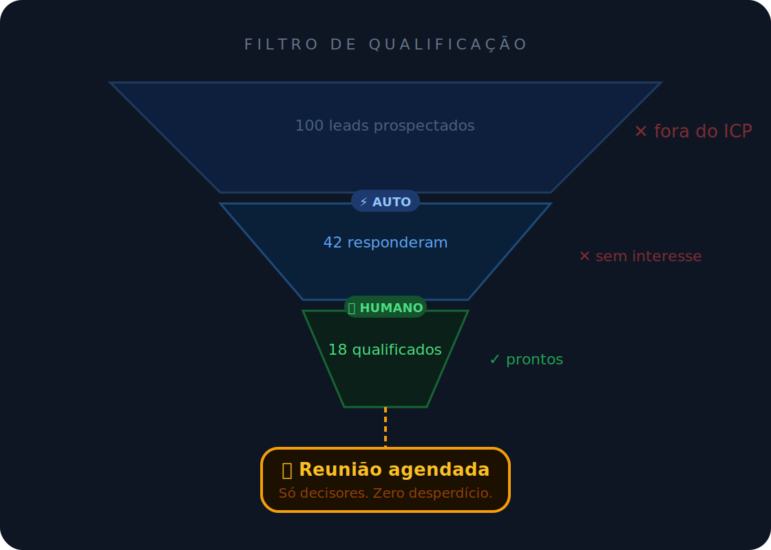 Fazemos isso mapeando quem tem o perfil exato para comprar de você, abordando por múltiplos canais e filtrando qualquer um que não esteja pronto — antes de chegar no seu time.